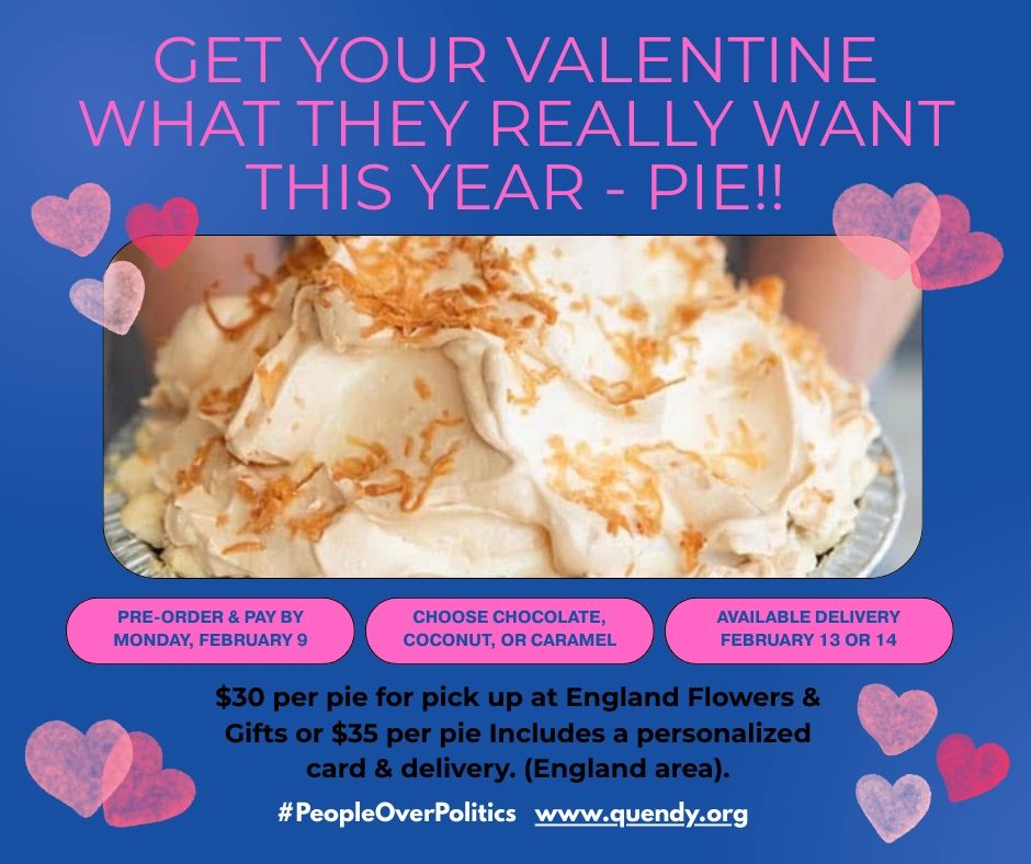 Surprise your Valentine with a delicious Charlotte's chocolate, caramel, or coconut pie. Order and pay by Monday, February 9. Choose February 14th pick up in England at England Flowers and Gifts from 11:00am-3:00pm($30) or delivery ($35) (England/Keo area). Profits will go directly to Quendy's campaign fund.